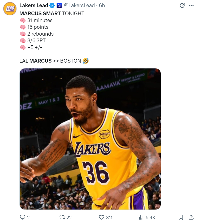 湖人媒体是这样评价斯玛特:斯玛特是让人意想不到的第三得分点,他在第四节无疑是湖人攻防两端最出色的球员,巨大的三分球命中建立巨大的领先优势。